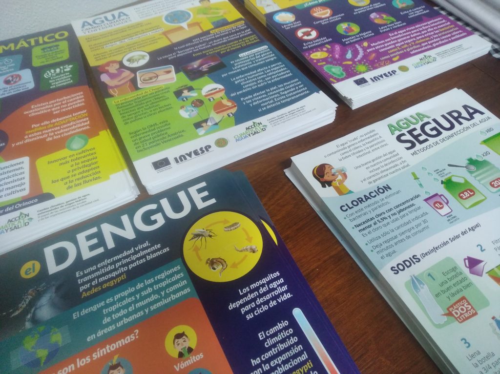 March 27, 2023 Entre las actividades del proyecto “Acción Climática, Agua y Salud” que ejecuta INVESP y Fundación Tierra Viva con el financiamiento de la Unión Europea se incluyen procesos formativos para miembros de las comunidades, docentes, personal de salud y funcionarios públicos sobre temas vinculados a la relación ambiente y salud. Es por ello que el pasado 21 y 22 de marzo, en el marco de la celebración del Día Mundial del Agua, el equipo de educadores de campo de Fundación Tierra Viva se reunió con integrantes de los consejos comunales, personal de salud, y funcionarios públicos de la Alcaldía del Municipio Tovar, en el estado Aragua, en el taller “Agua, Cambio Climático y Enfermedades”. A través de exposiciones, intercambios y actividades lúdicas, se compartieron informaciones y herramientas metodológicas para su labor como multiplicadores en sus ámbitos de trabajo y comunitarios. Tras recibir el taller, los participantes recibieron un kit de afiches sobre los temas tratados, diseñados especialmente para servir de apoyo en la divulgación de la prevención de enfermedades asociadas al agua y a acciones de mitigación y adaptación ante el cambio climático. Este tipo de taller, y los materiales producidos, se replicarán en los otros 6 municipios donde el proyecto “Acción Climática, Agua y Salud”, está siendo ejecutado como son El Hatillo (Miranda), Cruz Salmerón Acosta (Sucre), Maneiro (Nueva Esparta), Santa Rita (Zulia), San Diego (Carabobo) y Andrés Bello (Táchira). Todos los afiches están disponibles en la página web de Fundación Tierra Viva (www.tierraviva.org) y en el Portal de Desarrollo Sustentable (www.desarrollosustentableve.com) en la sección de “Acción climática, agua y salud”.