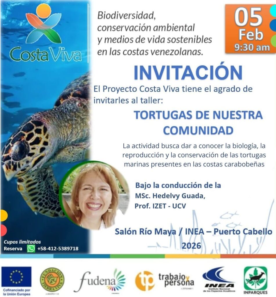February 4, 2026 Puerto Cabello, 4 de febrero de 2026. En conmemoración del Día Mundial de los Humedales, el Proyecto Costa Viva —impulsado por Fundación Tierra Viva, FUDENA, la Asociación Civil Trabajo y Persona y la Unión Europea en Venezuela— celebra su primer aniversario de gestión multianual con un evento de alto valor educativo: el taller «Tortugas de Nuestra Comunidad». La actividad se llevará a cabo este 5 de febrero a las 9:30 a.m. en el Salón Río Maya del INEA (Instituto Nacional de los Espacios Acuáticos) en Puerto Cabello. Contará con la conducción de la MSc. Hedelvy Guada, profesora del Instituto de Zoología y Ecología Tropical de la Universidad Central de Venezuela. El taller busca sensibilizar a la población sobre la biología y la conservación de las tortugas marinas que habitan en la costa carabobeña, un pilar fundamental para el equilibrio de nuestros ecosistemas marinos. ¿No puedes asistir al evento? Entonces te invitamos a consultar nuestra guía de tortugas marinas venezolanas en este enlace incrustado. Un año sembrando resiliencia en al costa Este evento sirve de vitrina para el balance del primer año de ejecución del proyecto Costa Viva. Durante este ciclo inicial, Fundación Tierra Viva ha logrado consolidar una red de gestión compartida junto al Instituto Nacional de Parques (Inparques), el INEA, Insopesca (Ministerio de Pesca), el Laboratorio BIOMAC de la Universidad de Carabobo y otras instituciones del sector ambiental, alcanzando hitos clave: Mitigación de Especies Invasoras: se conformó una mesa técnica para el control del PezLeón en zonas aledañas al Parque Nacional San Esteban, incluyendo diagnósticos para eldesarrollo de maratones de pesca y el festival gastronómico «Festileón». Talleres para docentes y salidas de campo con estudiantes de las comunidades de Gañango y Patanemo para aprender sobre la biodiversidad de los humedales costeros (manglares, albuferas y playas) del Parque Nacional San Esteban. Playas sostenibles: se coopera en acciones piloto en Isla Larga y Gañango, enfocadas en laformación de operadores turísticos en turismo sustentable, el saneamiento de áreasafectadas por el Manzanillo de Playa y la restauración tanto de manglares como deseñalética para la interpretación ambiental. Refuerzo de la gobernanza local: consultas directas y talleres técnicos sobre los ecosistemas marino costeros venezolanos dirigidos a autoridades y líderes comunitarios para garantizar la gestión de las costas sea sostenible y participativa. Divulgación ambiental: pendones, material didáctico, así como ilustraciones y reseñas pararedes sociales sobre los ecosistemas de las costas venezolanas. Con la mirada puesta en 2029, el Proyecto Costa Viva demuestra que la protección de nuestros humedales y especies en peligro, como las tortugas marinas, depende de una alianza sólida entre la ciencia, las instituciones y la comunidad. *** Fotografía de portada: Jordan Robins / Ocean Image Bank Sobre Costa Viva Proyecto ejecutado por Fundación Tierra Viva junto a la Fundación para la Defensa de la Naturaleza (FUDENA), la Asociación Civil Trabajo y Persona y cofinancianciado por la Unión Europea para promover acciones comunitarias que contribuyan a la conservación de los ecosistemas marino costeros y al mejoramiento de la calidad de vida de las poblaciones locales en los estados del litoral venezolano. Sobre Fundación Tierra Viva Organización venezolana, no gubernamental y sin fines de lucro fundada en 1996 dedicada a la educación, promoción y ejecución de proyectos sobre el desarrollo sustentable a través de estrategias de participación y acción social. Instagram: @tierravivavzla Correo: comunicaciones.tierraviva@gmail.com WhatsApp: Fundación Tierra Viva Costa Viva